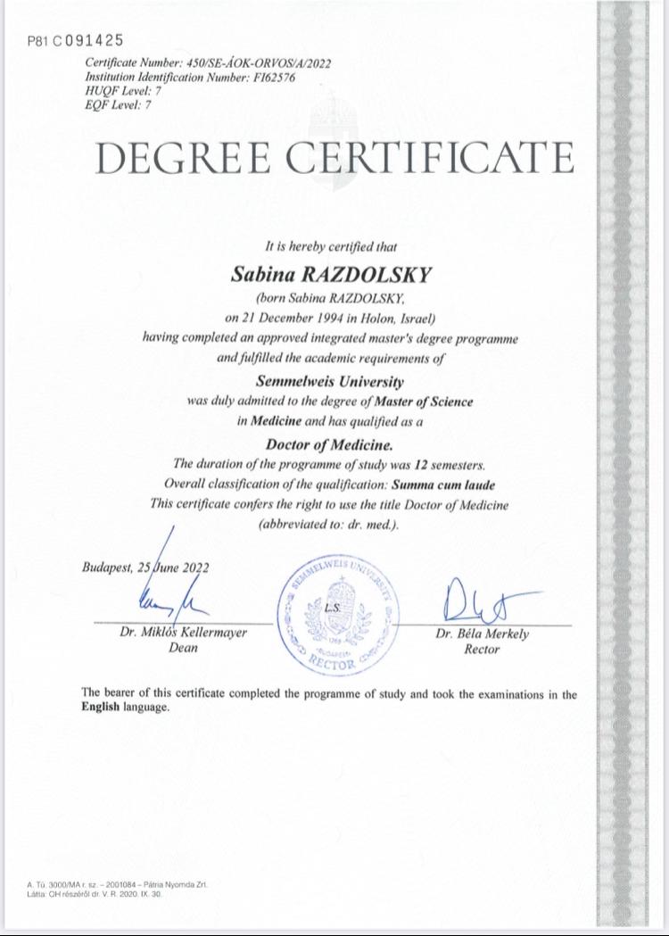 Dr. Sabina Razdolsky is an Obstetrics and Gynecology resident physician at Mayanei Hayeshua Medical Center. Born on December 21, 1994, in Holon, Israel, she pursued her medical education at Semmelweis University in Budapest, Hungary, completing the rigorous six-year English-language program and graduating in June 2022 with a Master of Science in Medicine / Doctor of Medicine degree, Summa Cum Laude.